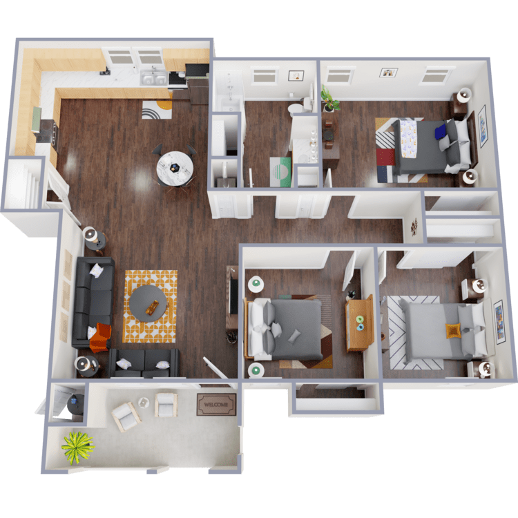 Our one, two, and three-bedroom apartments for rent will be designed with the amenities you deserve. Each has been carefully crafted to offer comfort and functionality, ensuring every resident feels at home. All residences have air conditioning, ceiling fans, an all-electric kitchen, microwaves, walk-in closets, and a washer and dryer. A balcony or patio increases your living space and adds a relaxing space to unwind.